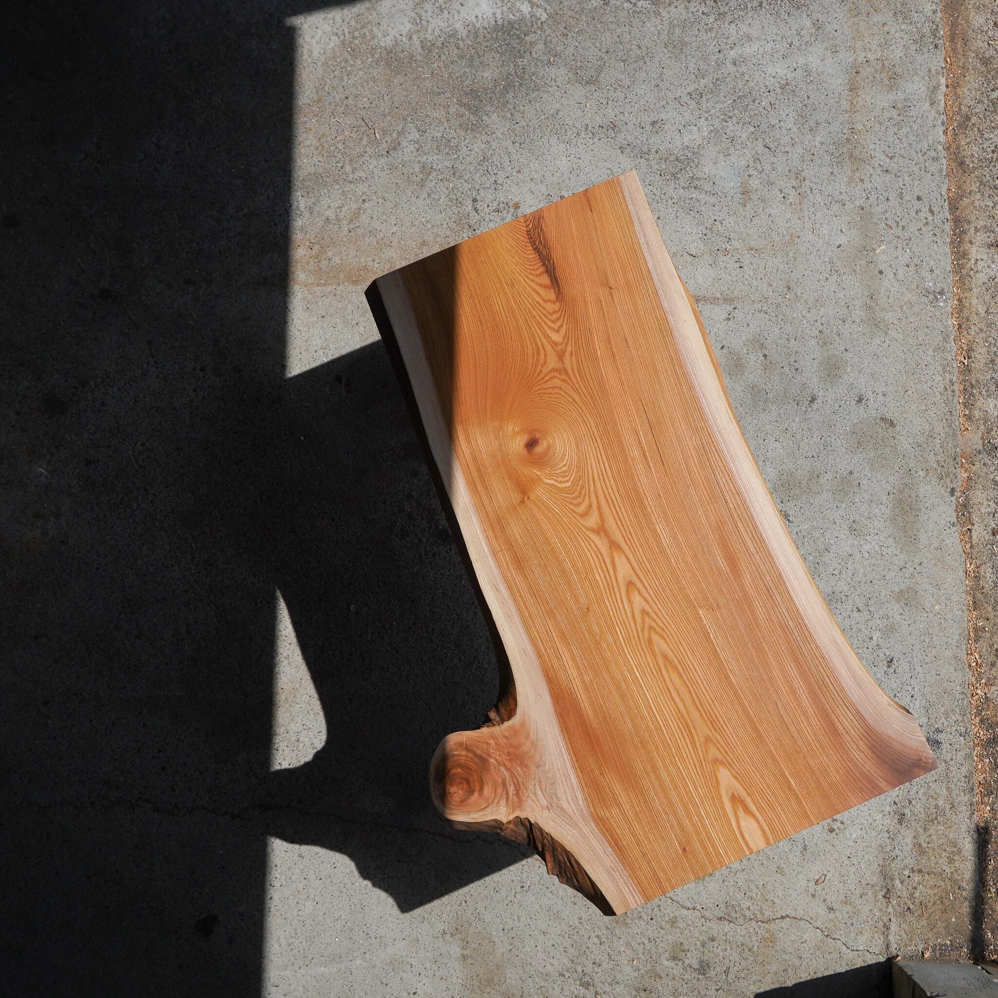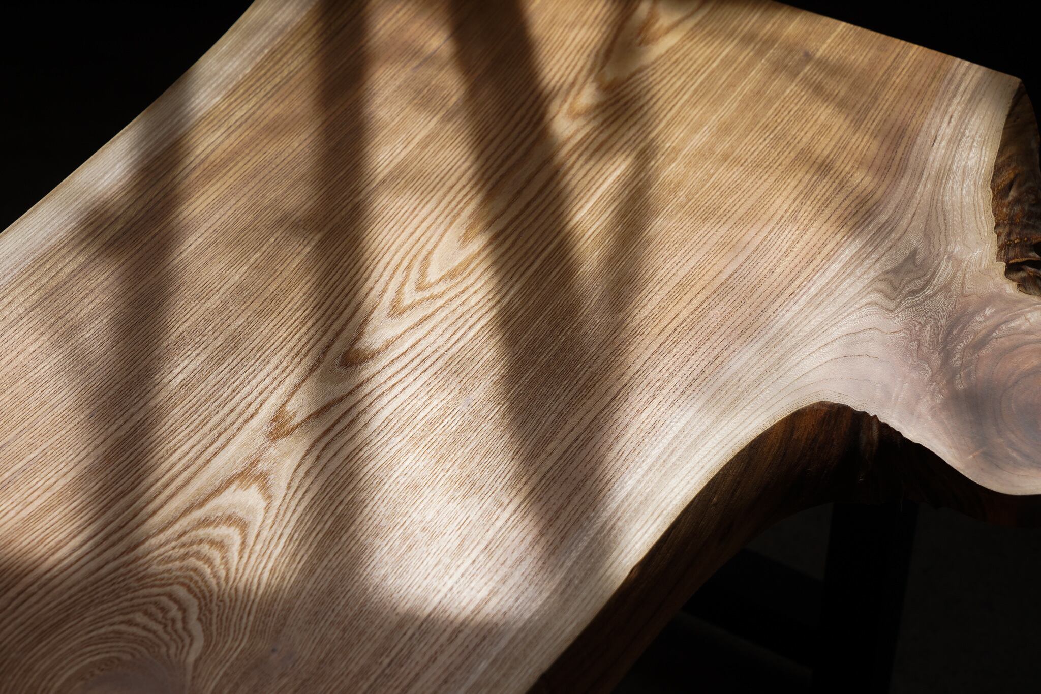 本材も欅の良いところが詰まっています。太く明瞭な年輪のラインは美しいの一言。欅は無骨なのに綺麗なのが不思議。相反する要素な気がしますが、欅の中ではしっかり共存しています。本材には取り立てて言及すべき模様はありません。だけどこれが良いんです。毎日一枚板を触っていると、杢目が派手な板も良いけれど、この欅のような「穏やかさ」もとても大事だと思わされます。毎日つかう物だから、目に優しいというのも重要な要素なんだと思います。