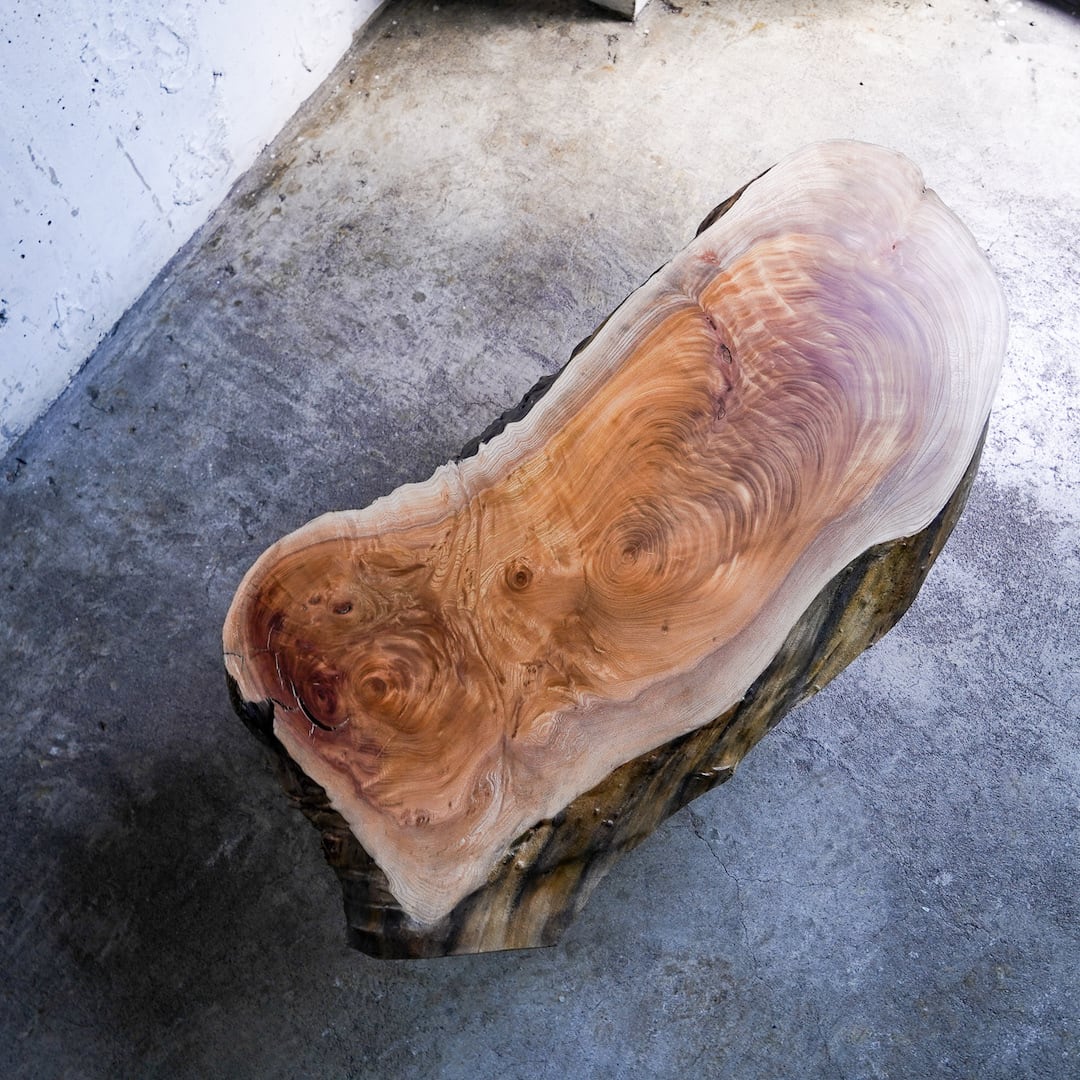 このような分厚い輪切り材はどうしても「和室の座卓」っぽくなって、倉庫に眠らせてしまいがち。人の心を惹きつける良木はどんどん活用していきたいです。