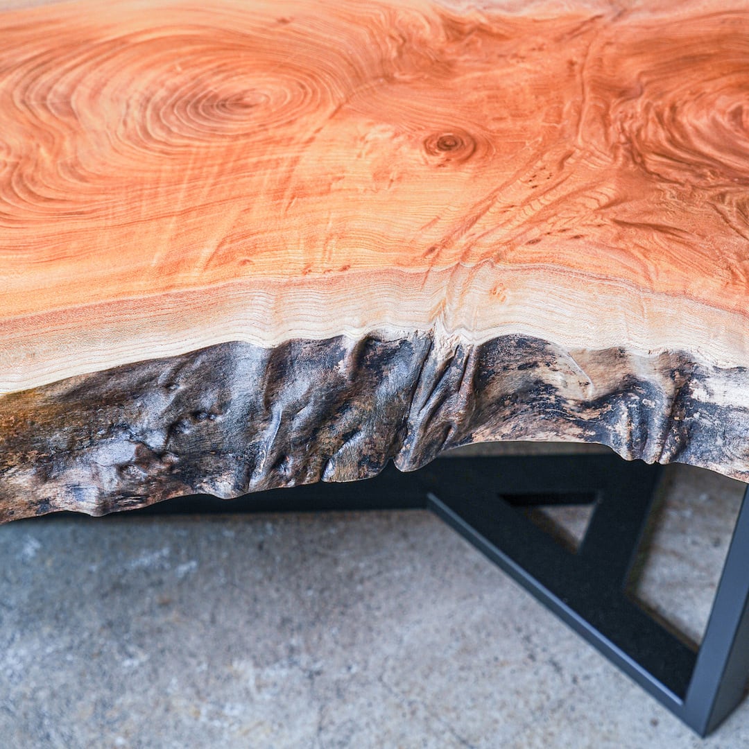 本材の長所は、大口径の輪切り材でありながら目立ったひび割れが無く、辺材までしっかりと硬度があり、全体的に澄んだ色合いが美しいところです。しっかりと大地に根を張って踏ん張って来ました、と言わんばかりの凝縮感です。樹齢は100年を超えるでしょう。