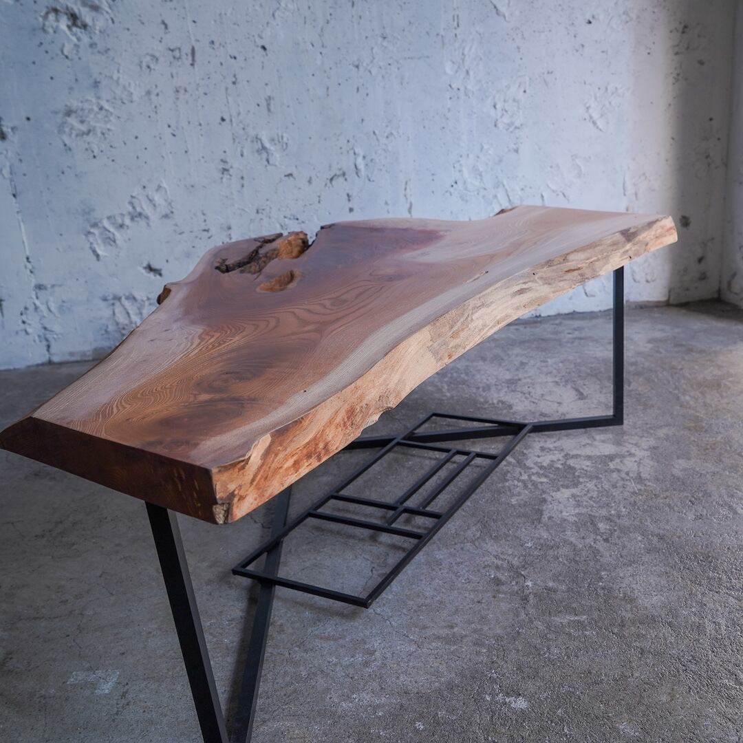 色が最も濃いサバ杢部分→心材部分→辺材部分の濃→淡が美しい欅の一枚板ローテーブルです。加工してはじめて分かる良木感。どっしり重厚なので女性一人では持ち上げられないかもしれません。