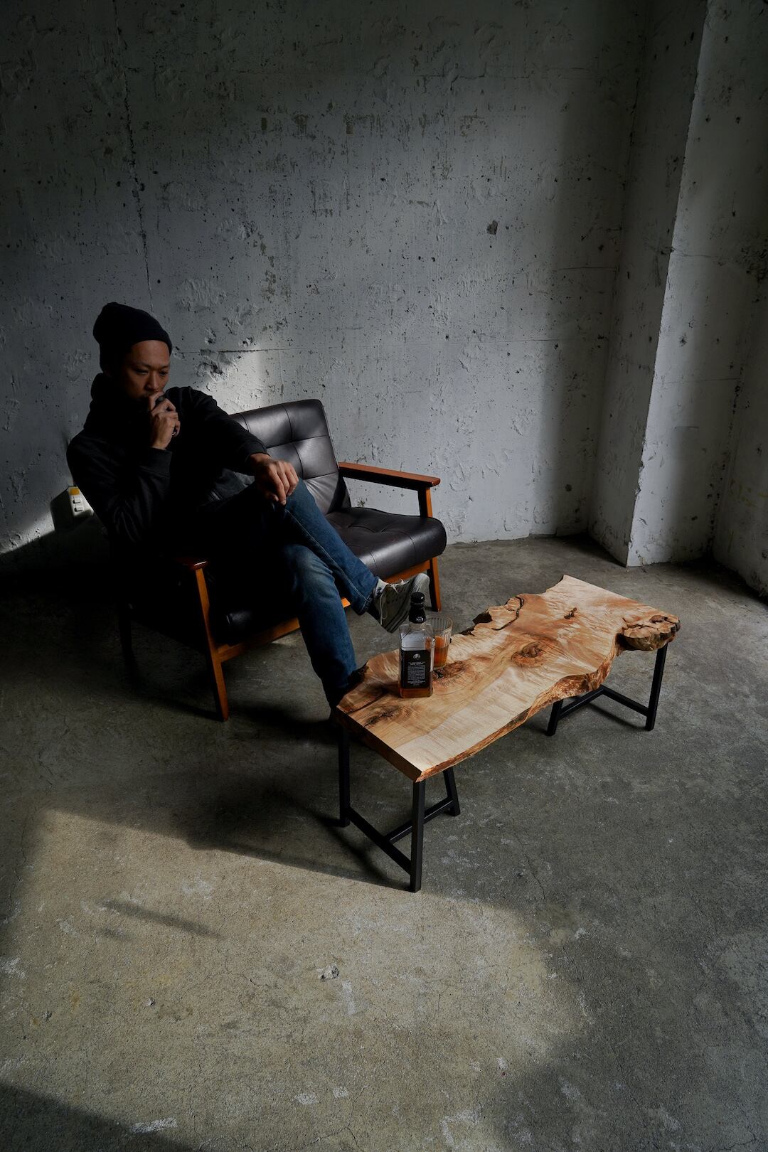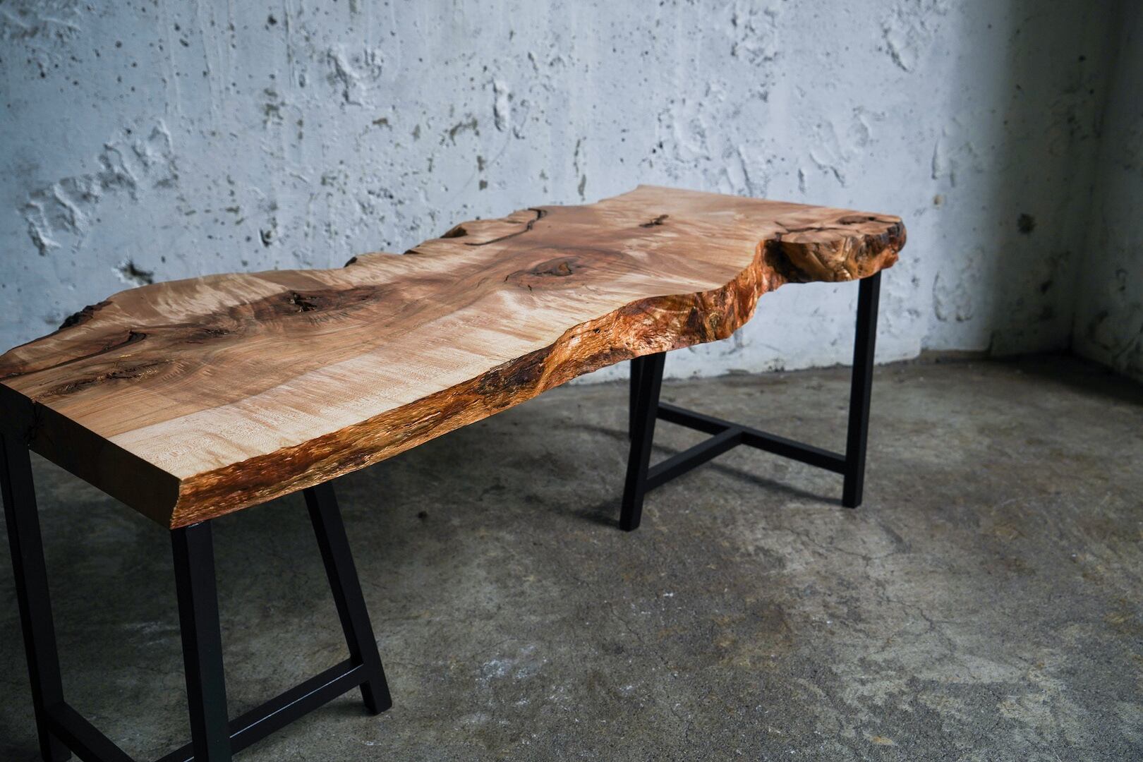 本素材はエッジのラインも魅力的です。直線的な樹皮のラインも良いですが、本作のような凸凹とした曲線美もまた一枚板ならではです。