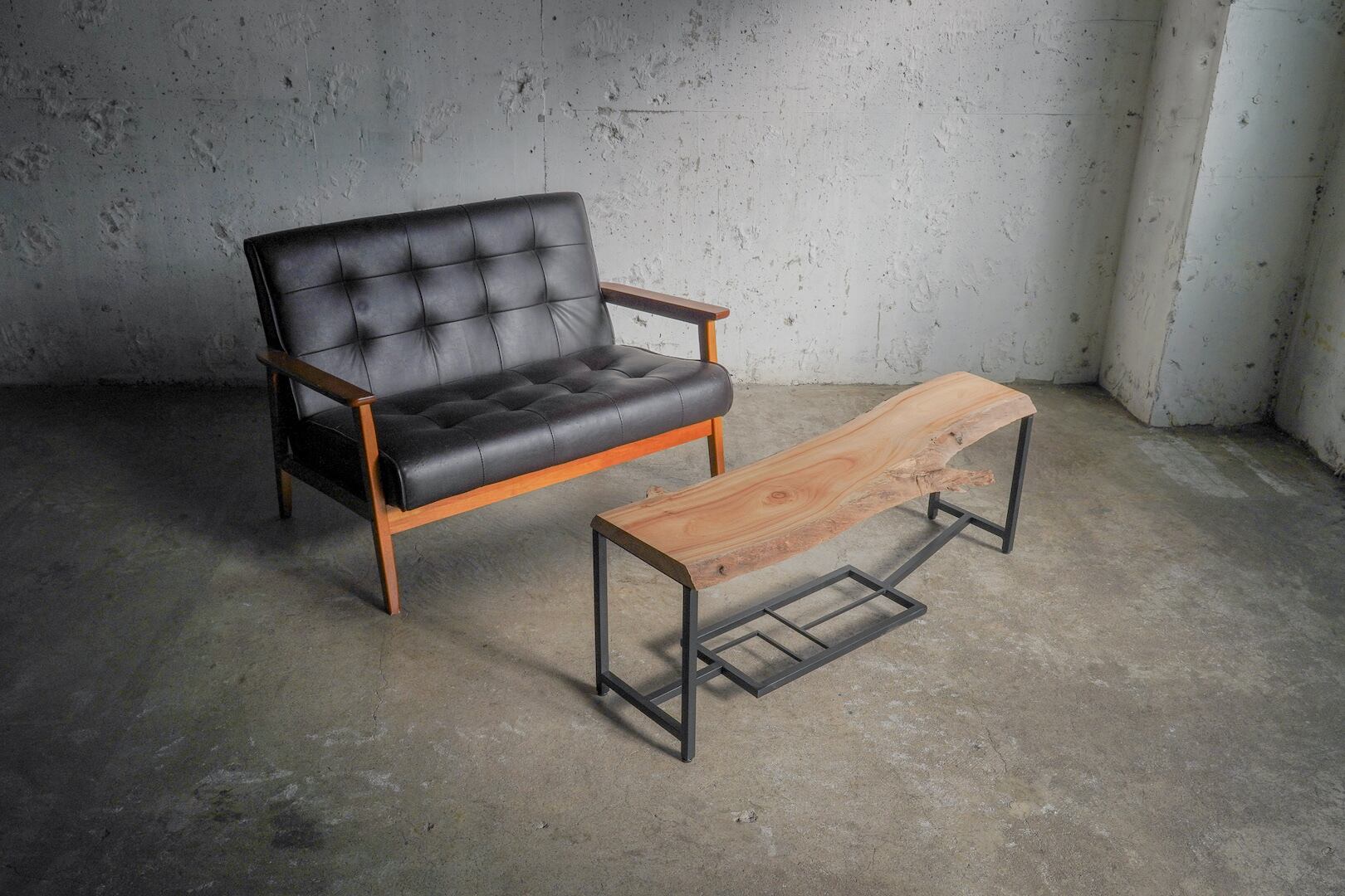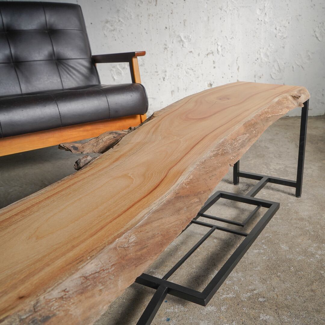 木の流れに合わせて作ったアイアン脚には棚(のようなもの)を付けています。机の上を散らかす作者的にはこういうちょっとした物の逃げ場所があると嬉しいです。