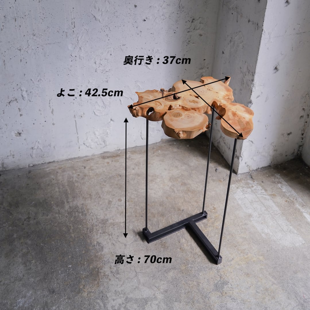 本材はかなり個性的な形をしているので、観葉植物でも特に見た目にインパクトのある多肉植物を置く為に作りました。まあ何を置いてもいいんですけどね。背丈の低い植物を置くというイメージなので全高は70cmと高めです。