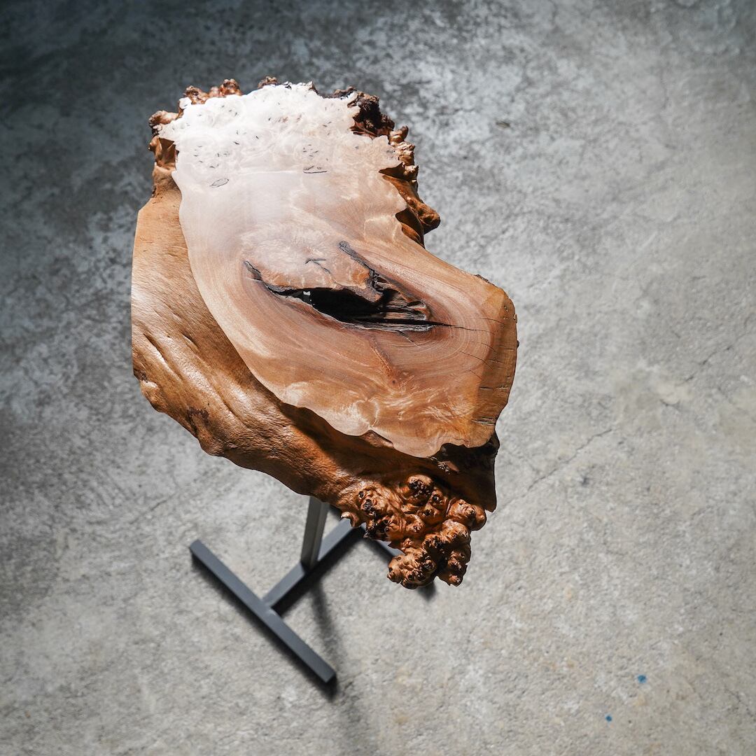 ミズメというあまり馴染みのない名前の木の「瘤の輪切り」というこれまたレアな素材で作った小さなテーブルです。天板のサイズが小さいのでコンソールテーブルということにしていますが、使い方はそれぞれという感じです。瘤らしい杢目が先端部分に浮かんで特徴的ですが、瘤のまわりの流れるような木目ラインも綺麗だと思います。貫通している中央の穴も味があっていいんじゃないでしょうか。