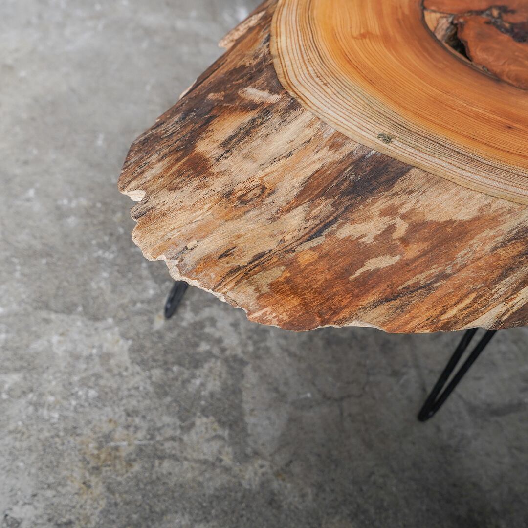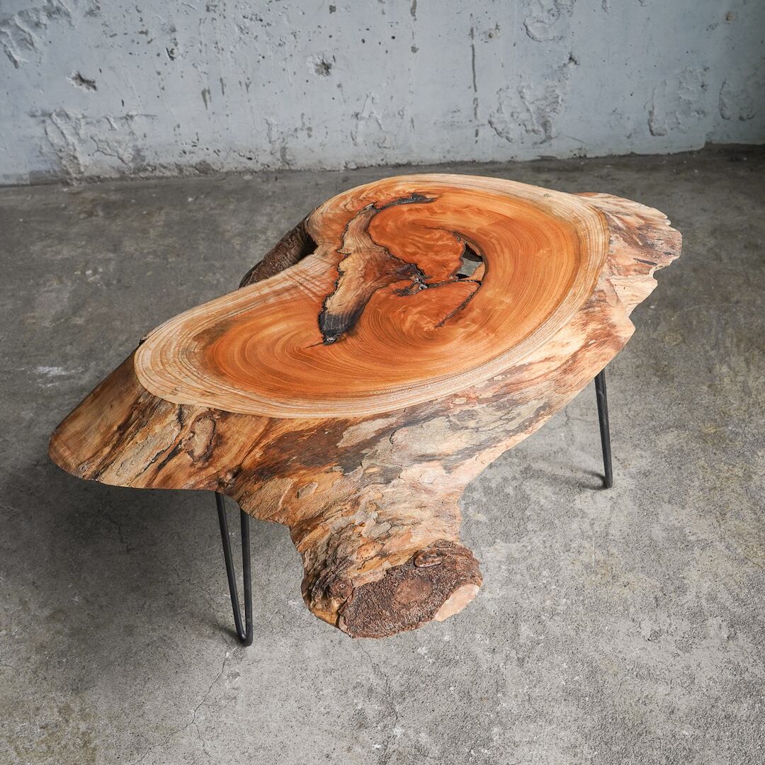 楕円からちょこっと枝が飛び出たかわいらしい形の欅の輪切り材で作ったコーヒーテーブルです。天板の表面にはうっすらと杢目があり大きな入皮や穴が開いていて表情が豊か。木としての質も上々の欅です。