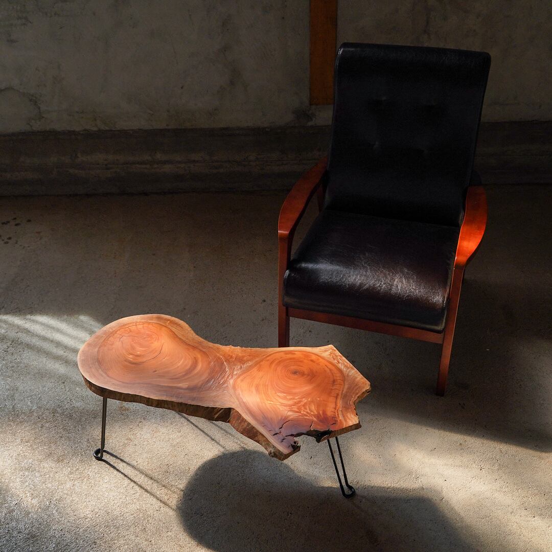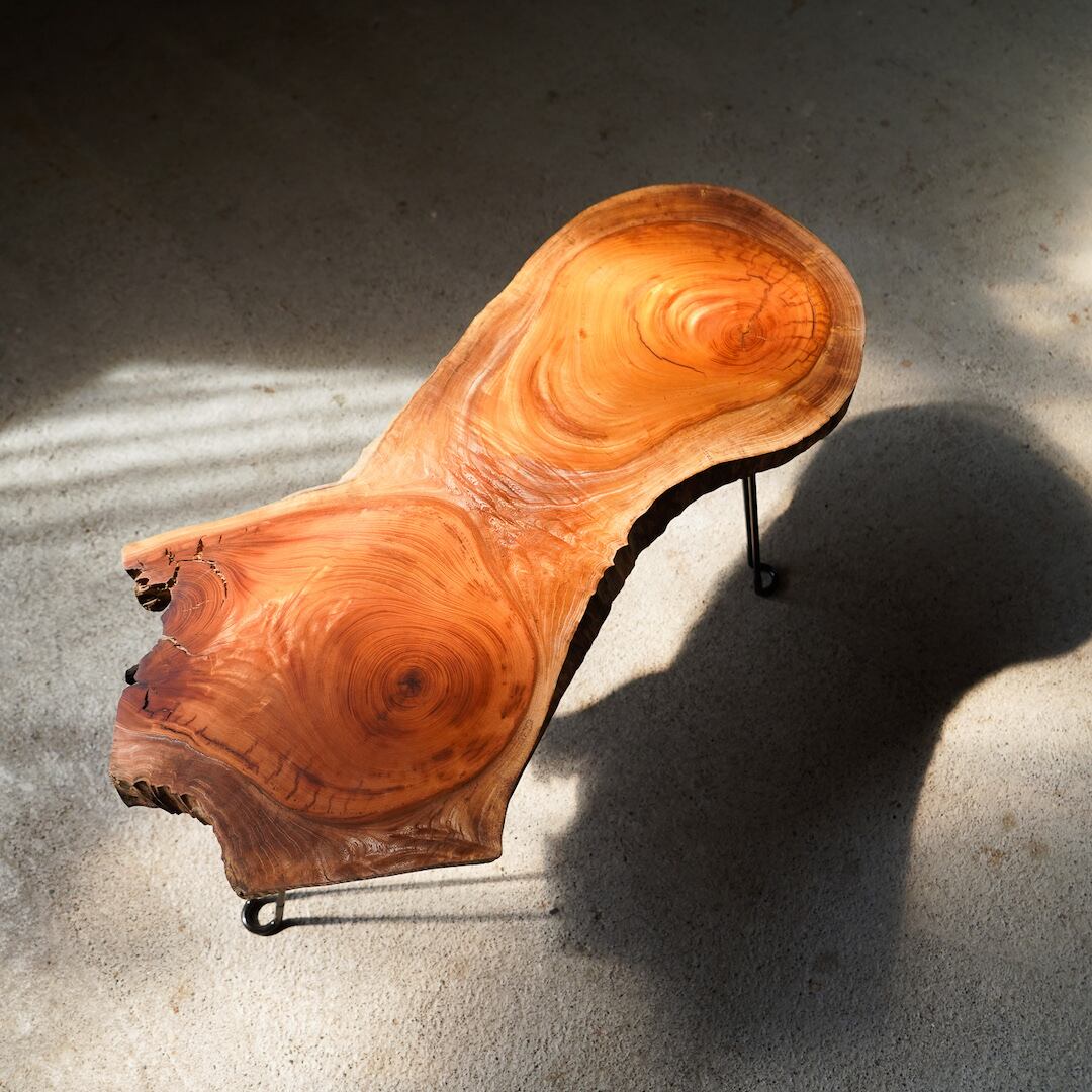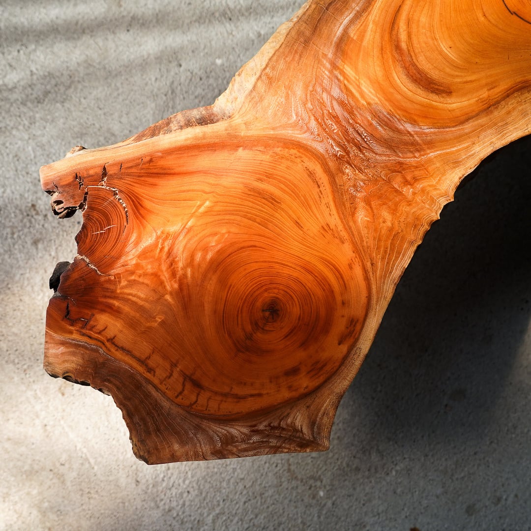 チェーンソーカットの跡や、エッジにはいった入皮、浅めの干割れなどなど、大きな原木丸太の端っこらしい愛らしさのある端材。作者の大好物です。