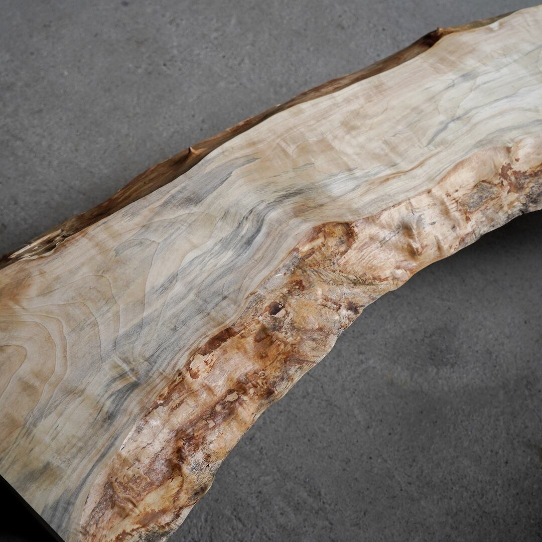 さて、本材の特徴はやはりダイナミックな曲がり方。本来であれば敬遠されがちですが、曲がっているから良いんです、と言いたいワケで。樹皮部分の凹凸も見る目を楽しませてくれます。この栃は杢目が控えめなのですが、それもまたよし。毎日視界に入れる物に派手さは不要らないと思うのは私だけではないと思います。