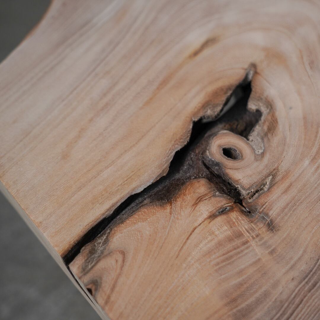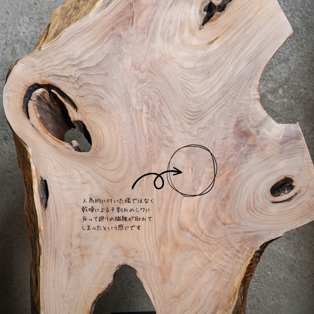 本作の桐はおそらく枝が3〜4本に分岐する「アタマ」の部分だと思われます。枝が折れてそこから雨水が入ったのか、中腐りを起こしてぽっかりと空洞が開いています。