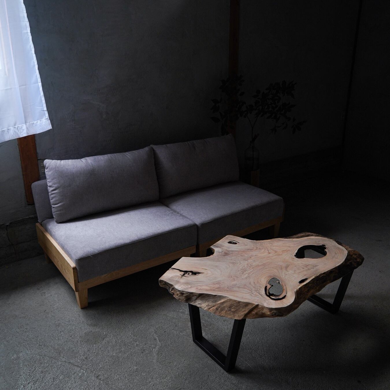 程よい穴がぽっかりと開いた桐のローテーブルです。