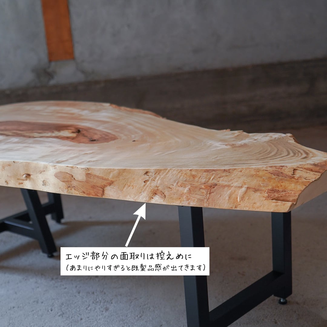 もちろん本材も端材です。こんなに大きくて立派なのに?と思われるかもしれませんが、本材の場合は目廻り(←こちらも長いので割愛します。検索してみてください。)という欠点と、11枚目の画像にある「斜めカット」の跡によって端材カテゴリーに分類されたのだと思います。この2点の欠点(?)の為に通常の仕入れ額より格段に安く手に入れる事ができる、と言うわけです。