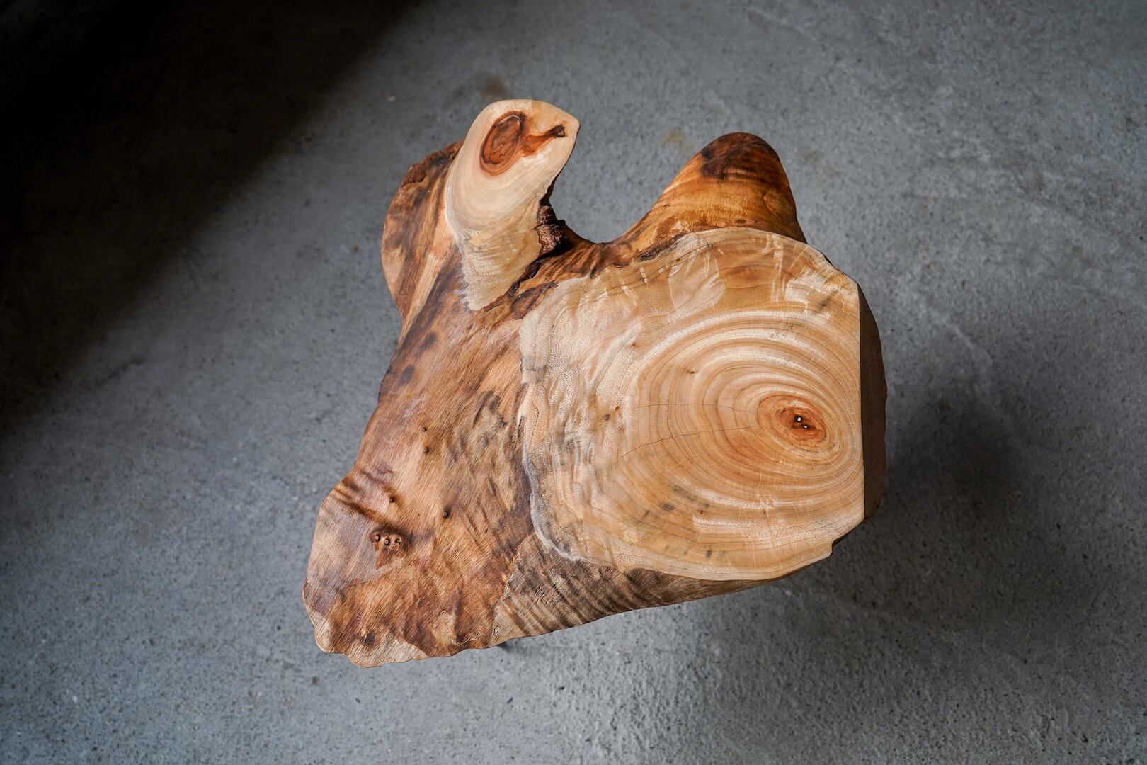 楠の輪切りで作ったコーヒーテーブルです。大きな枝の根本部分をスライスしたような形。何に使うのかパッと見では思いつかない素材 = ほっとけば捨てられるか薪にされるような端材らしい端材を使うのはとても楽しい作業ですが、なかなか良い素材(好みの素材)には出会えません。その分いい物を発見した時の喜びは何にも変え難いものがあります。本材も伐採からかなりの年月を経たような感じです。何に使えるか分からないけど捨てるには惜しい、本材もそんな存在だったんでしょう。