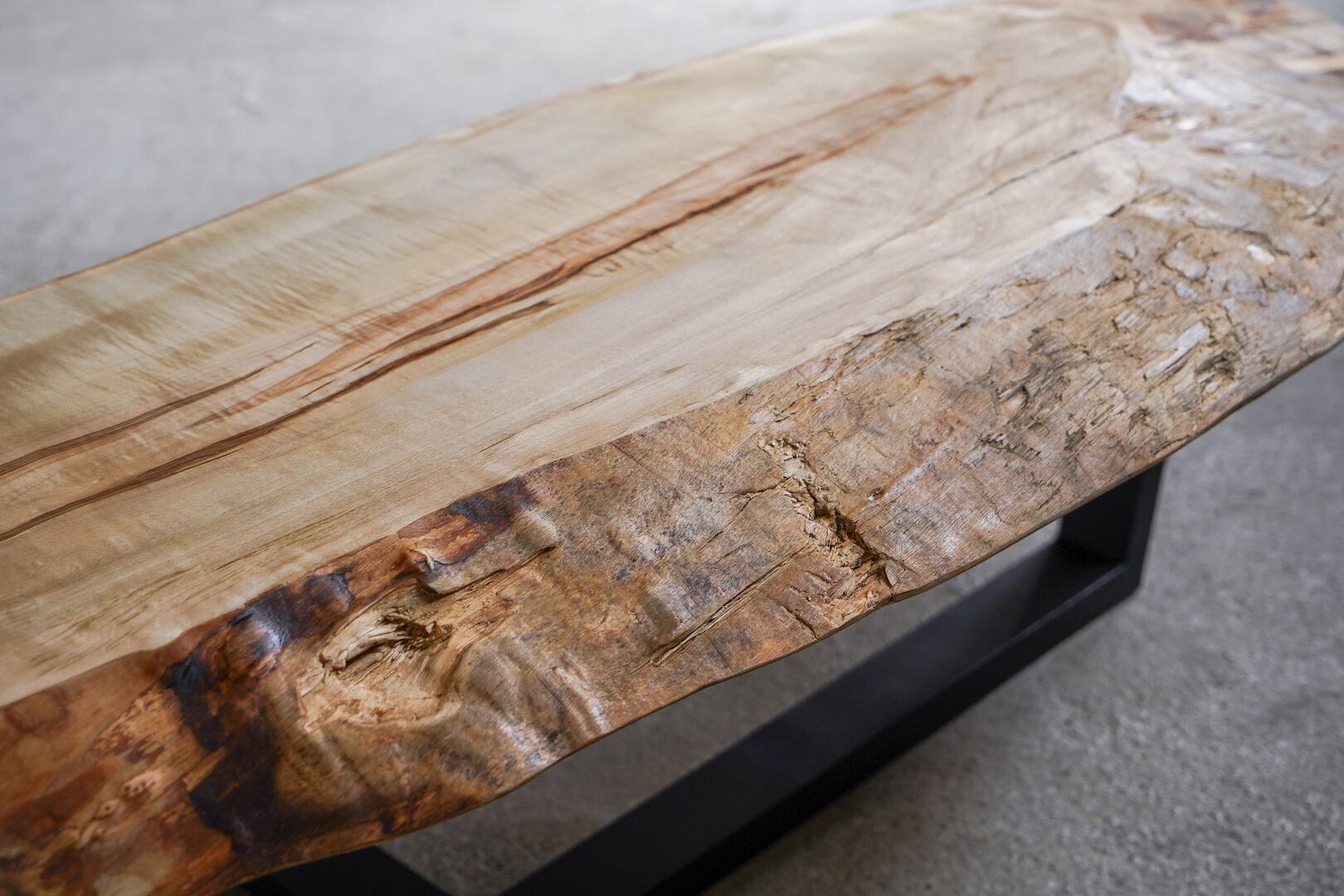 キレイな楕円形なんですが樹皮部分には大小様々な傷があります。一般的な一枚板テーブル屋さんだと、外側の樹皮の部分をすべて除去し、さらに傷がある部分は傷が見えなくなるまで深く削ります。身の部分まで深く削るので、その削った部分を自然に見せるために人工的な曲線をつけてます。なぜそんな事をするのか?それは「はやく多く売りたいから」でしょう。より万人受けを狙って木材の欠点をひたすら隠す加工です。