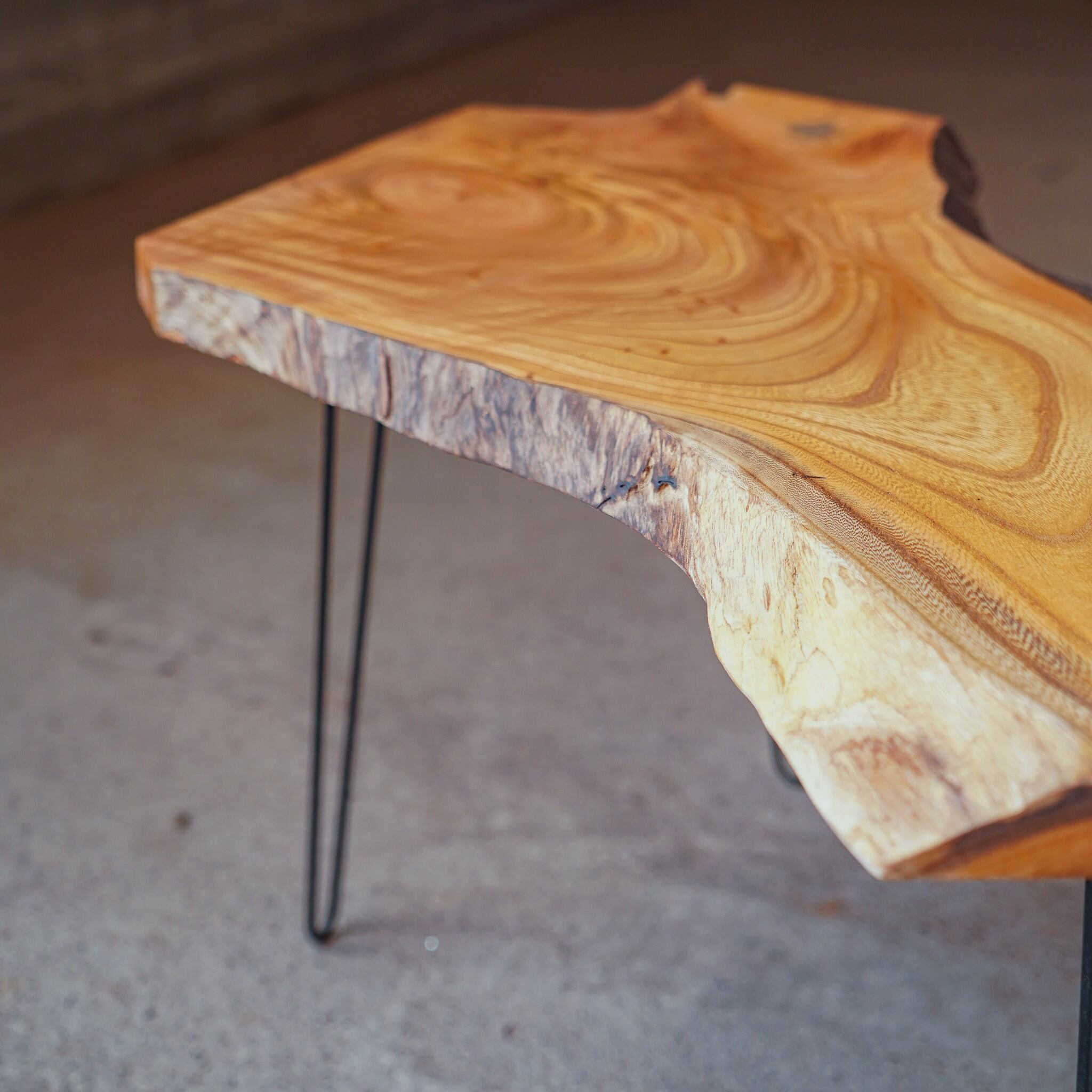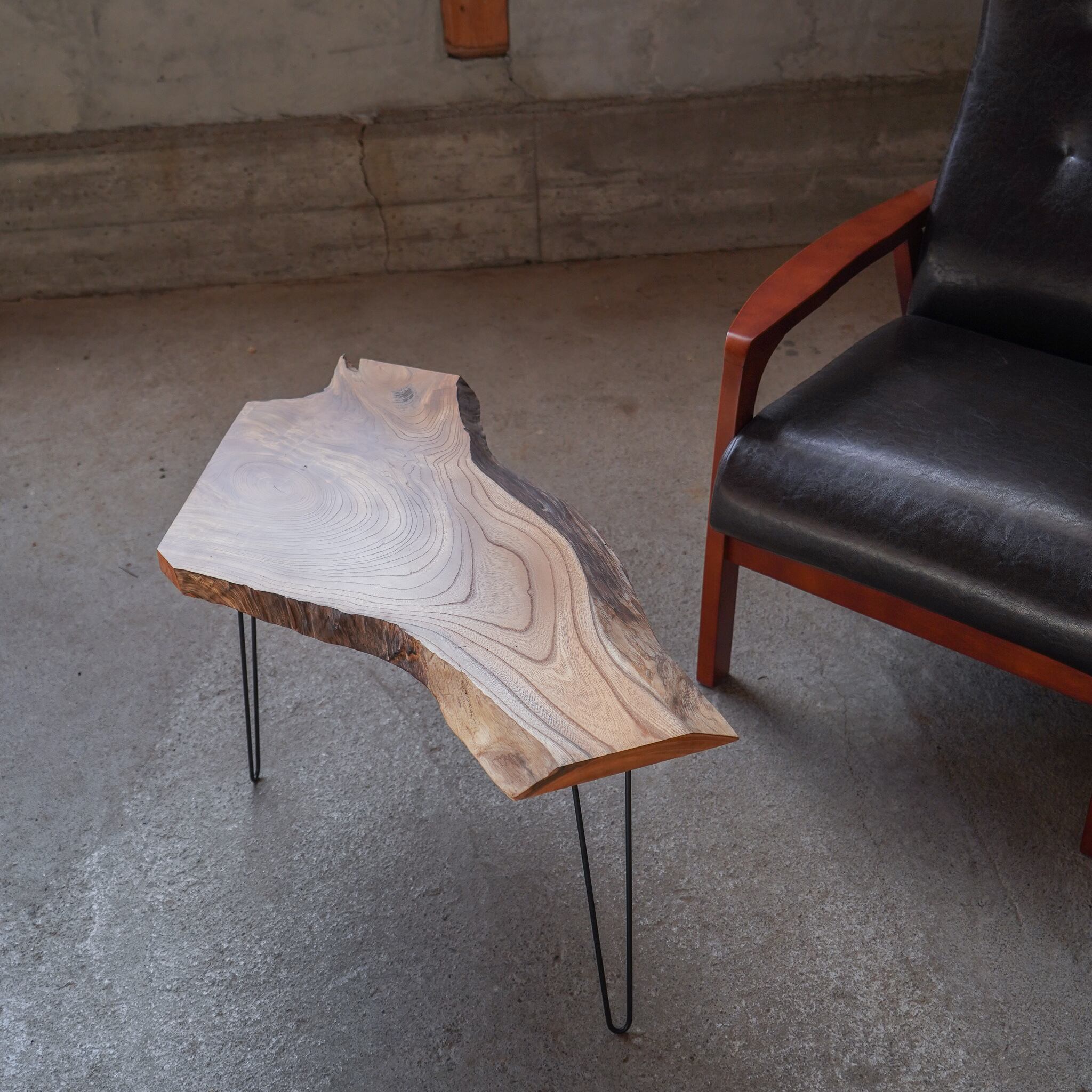3箇所ある小口の各エッジ部分が美しくなかったので、いっそのことスパッと落とすことでスッキリさせました。目が行くところを減らして、この欅がもつ素材の良さに自然と目が向けばな、というイメージです。リカットした3辺は適当に切っています。適当というと語弊がありますね。3辺とも角度や位置はランダムで何かに合わせる様な事はしていません、という意味です。もちろんどこで切るか、どの角度にするか、バランスをとるのにじっくり悩んでからカットしています。
