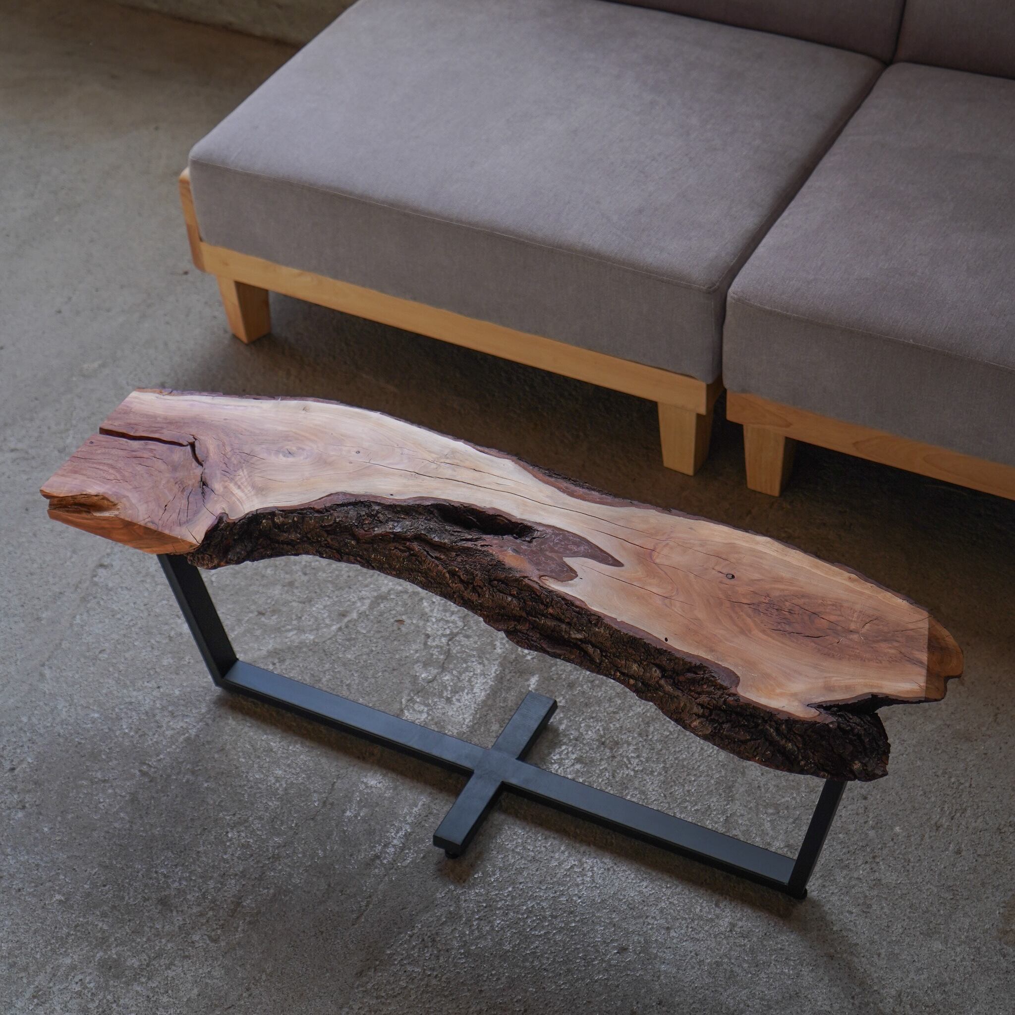 大きなスモモの木で作ったローテーブルです。脚部は最近作者が好んで製作しているデザインです。長くて細い素材にピタッと合いますし機能も十分で見た目がミニマル、よって空間とも調和しやすいんじゃないでしょうか。足の小指もぶつけにくいかも。