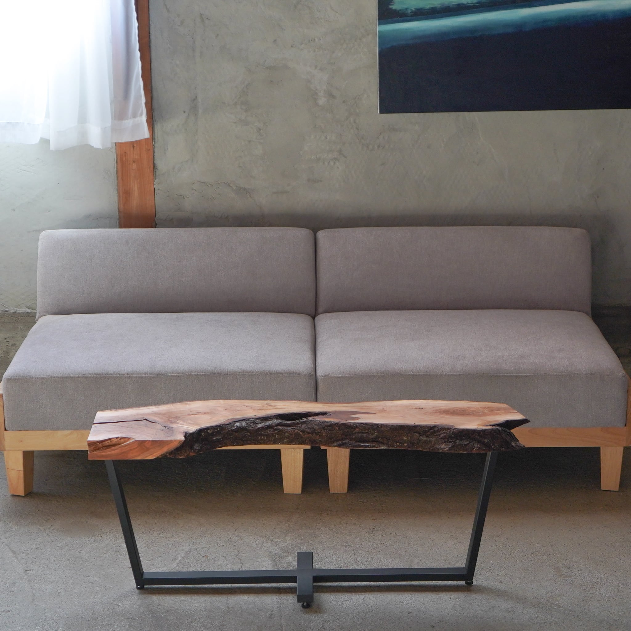 第二の人生はテーブル天板として活躍です。本材の魅力はなんといってもそのごつごつとした樹皮でしょう。本来であれば樹皮は除去されることが多いです。一枚板テーブルでこんなにごつごつした樹皮を敢えて残している板って見たことないんじゃないでしょうか?もちろん綺麗に除去してしまうのは悪い事ではありません。