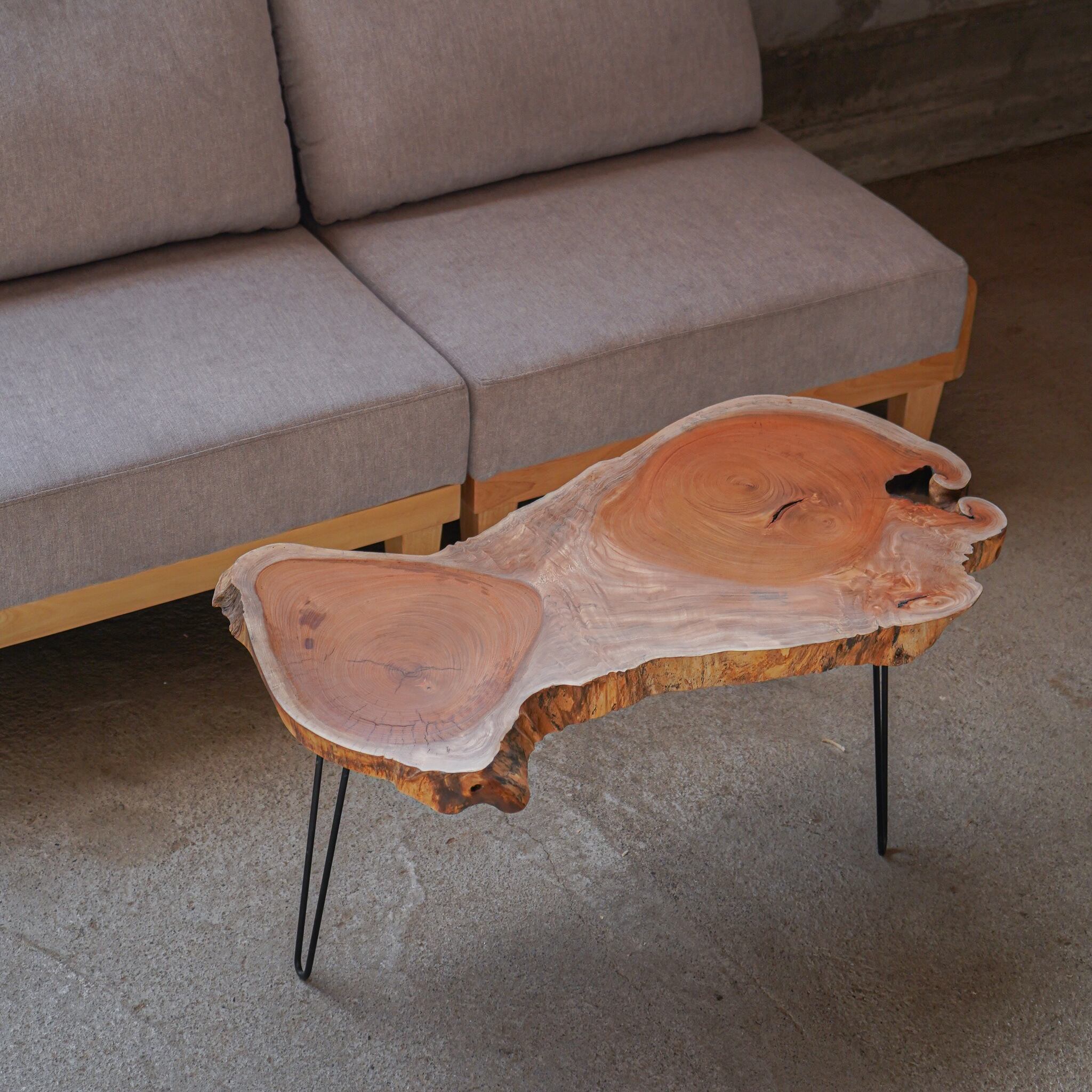 大きくて個性的な形をした欅の輪切りのローテーブルです。
