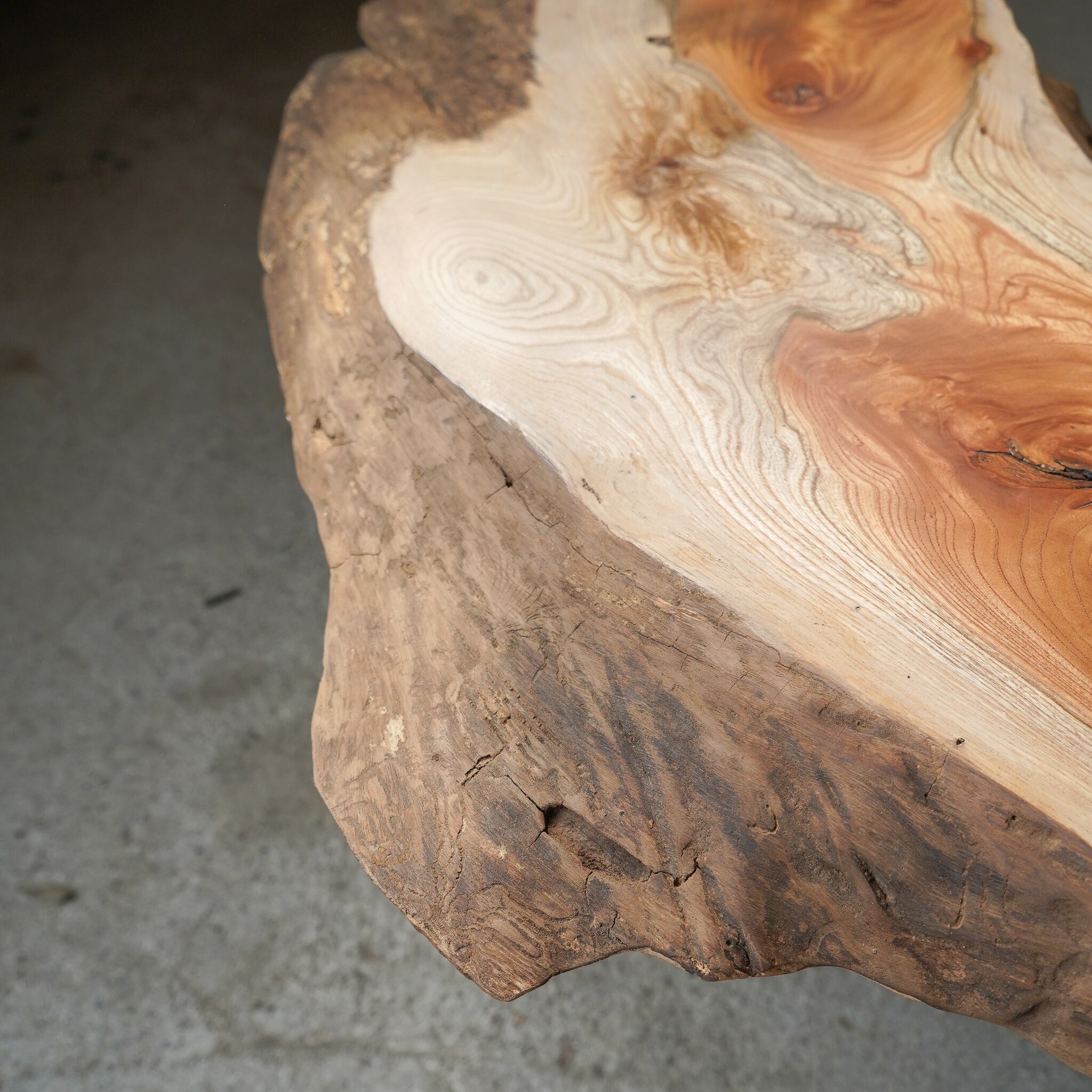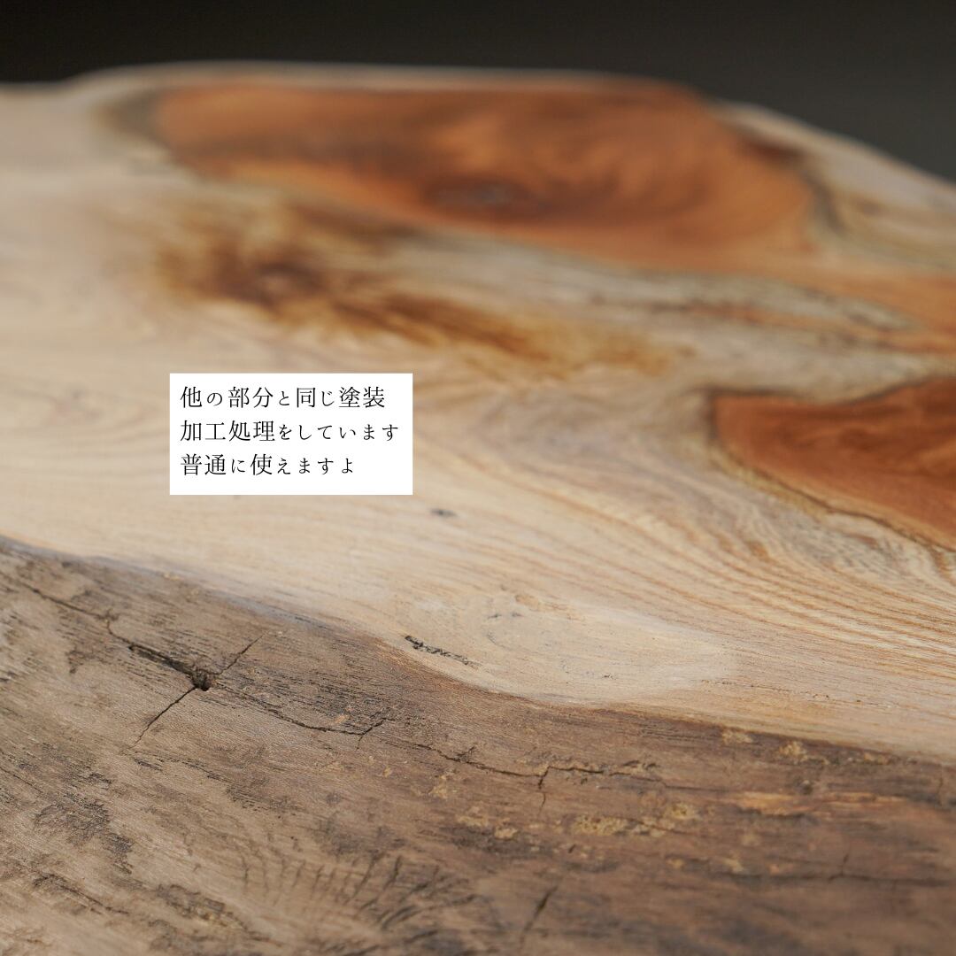 欅は通常、辺材(=本材で言うと外側の白い部分)が弱いので、保管状態が悪ければ強度が落ちてしまい、テーブル材として使えなくなっているものもあります。強度が一度落ちてしまうと再び上げることは出来ません。ですが逆に健全な状態のまましっかりと乾燥させた後、一般的な住環境で使用するのであれば、辺材が脆くなっていくことはありません。