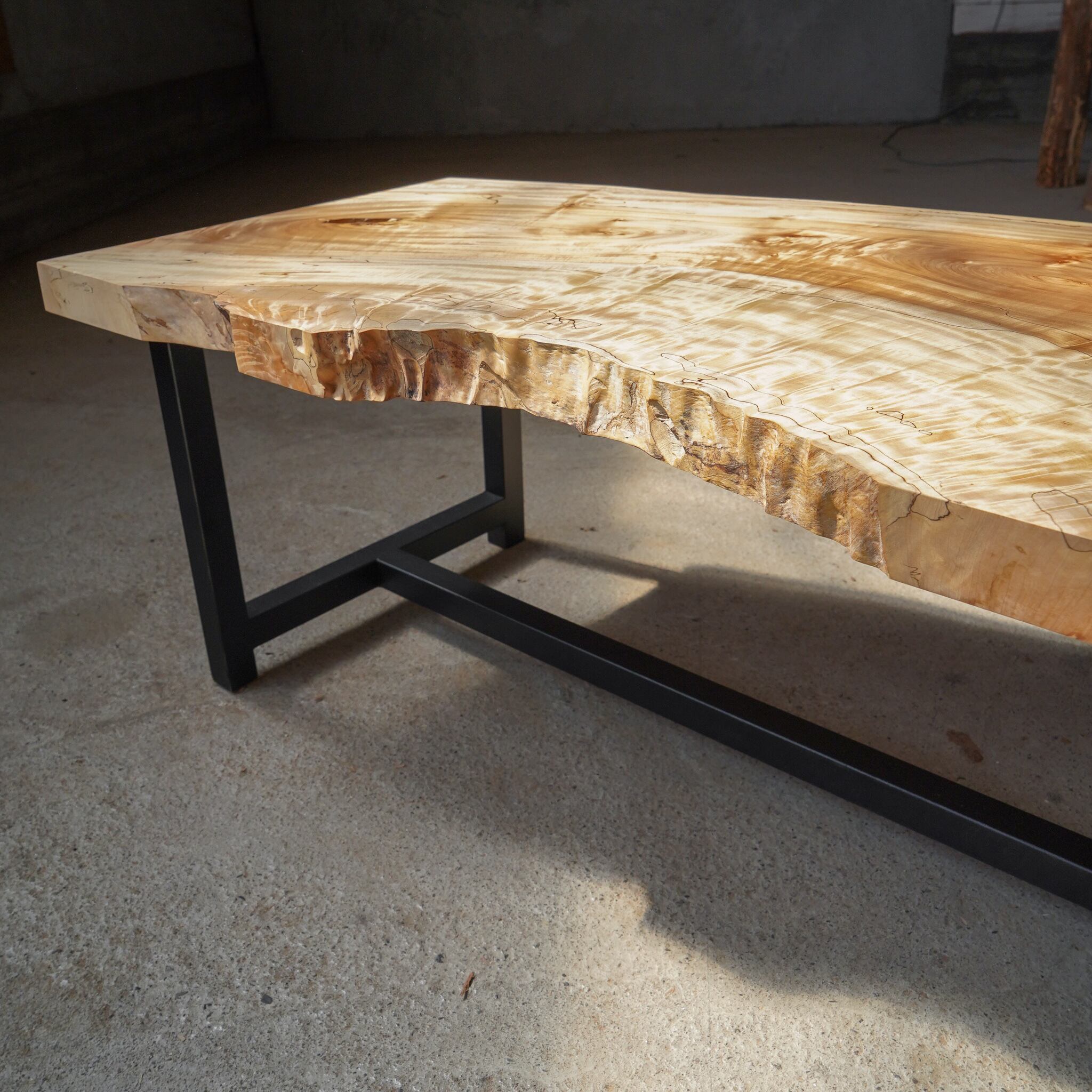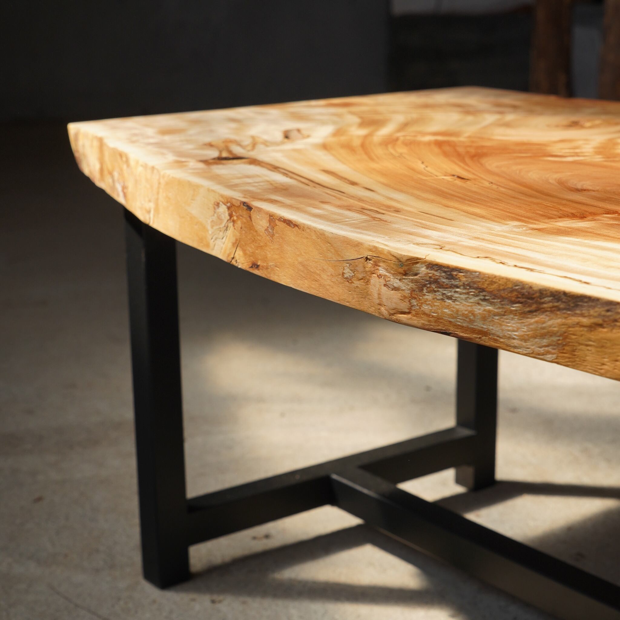 キラキラとした杢目にさらにスポルテッドの黒い流線がきれいな栃のローテーブルです。