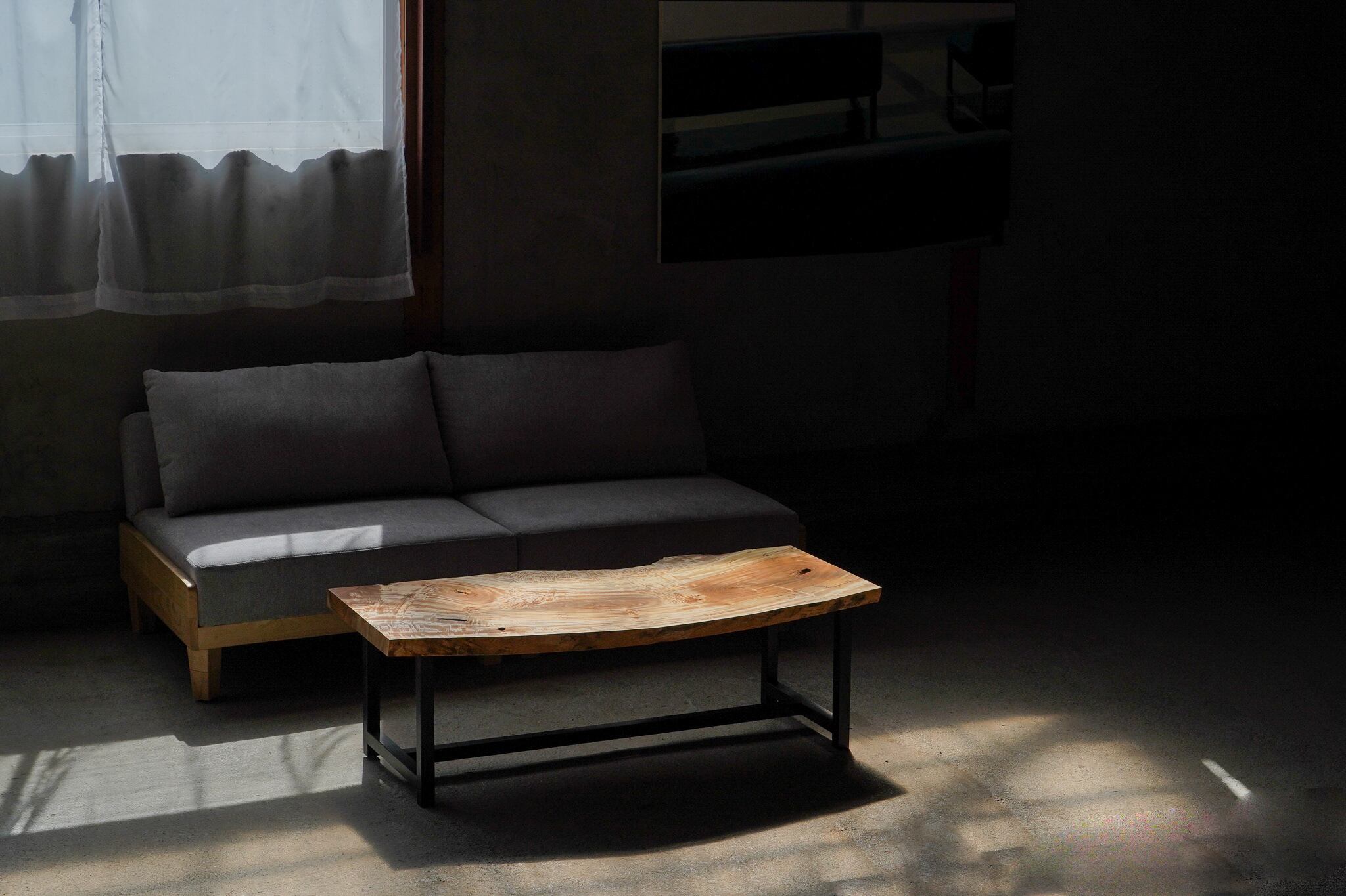と言う訳でまずはカタチの話から。このグネーっとした大きなカーブ。良くないですか?大きなカーブの辺は手を加えず、その他3辺をカットしています。そうすることで大カーブと対の小カーブを強調しようという意図です。これがスキッとした直線だったらどうでしょう?こっちのほうが面白いに決まってますって、絶対。面白いから一枚板特有の「ドヤ感」も感じません。