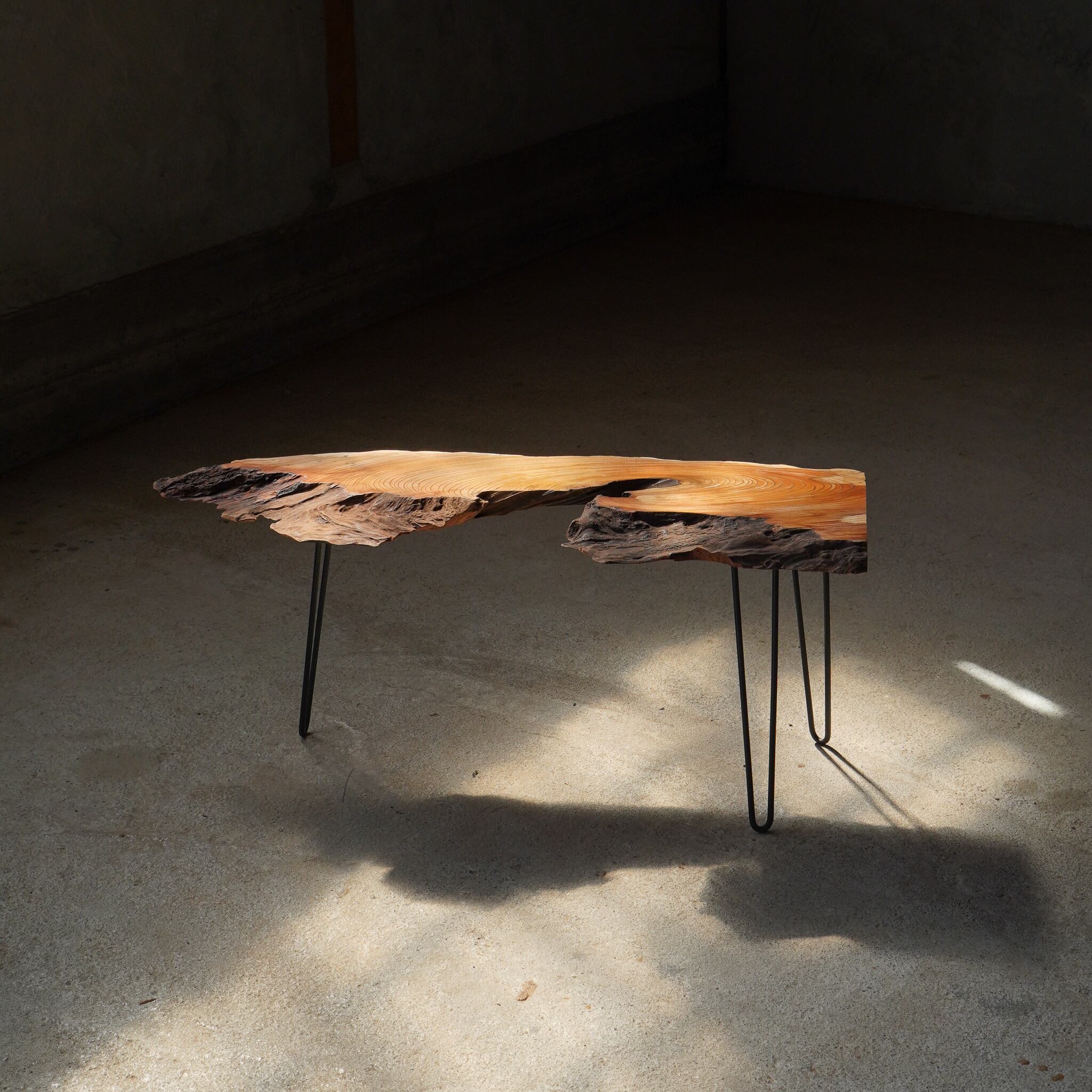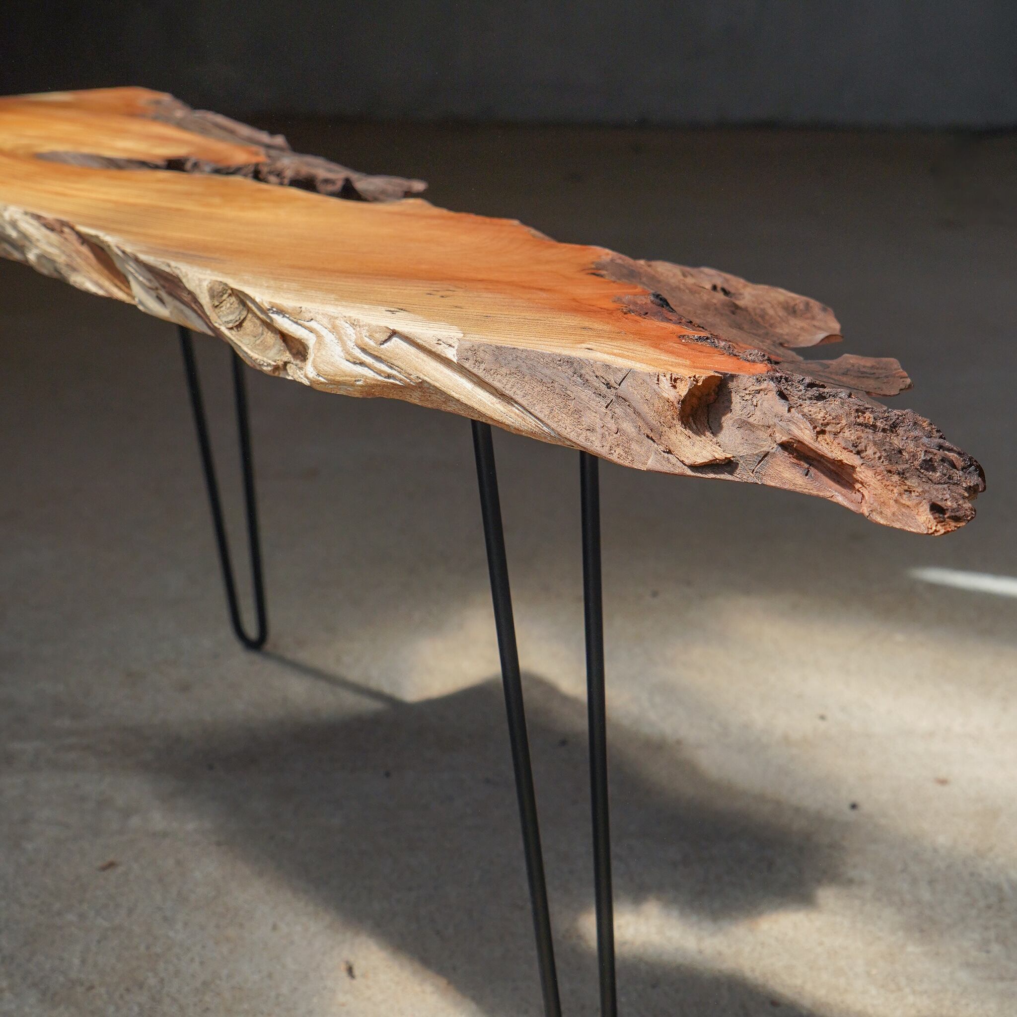 ボロボロとした辺材の部分はしっかりと強度のあるところまで特殊な道具で削り落とし、外れそうな樹皮部分はひとつひとつ確認し手作業で除去していきます。しっかりとした強度(しっかりくっついている樹皮)のみ残した後は、尖った部分をひとつひとつやすって先端を丸め、手触りに鋭利な感触が残る小さな凹みのエッジをひとつひとつ360°処理していきます。