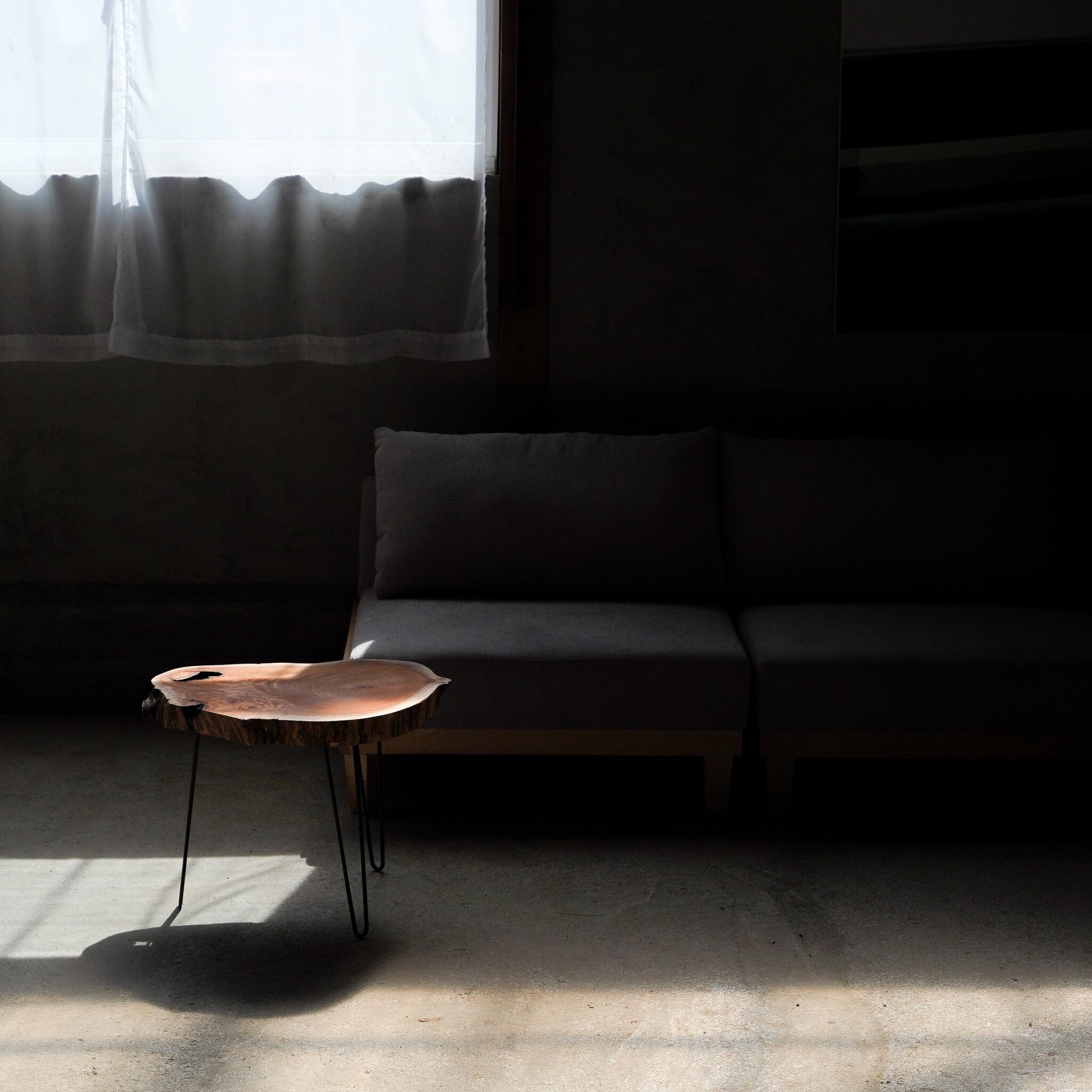 端正な丸ではなくちょっとシズク型というか、楕円というか、かわいらしい形をしています。厚みも5cmあるのでコロンとした雰囲気が増していますね。輪切り材で言うと、小サイズの素材は厚みがあるとかわいく見えます。大きいサイズで分厚いと途端に「和」が出ます笑。
