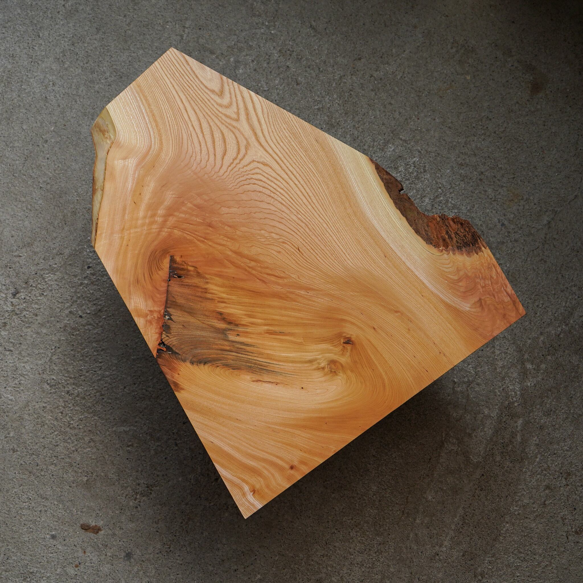 もともとは2辺に樹皮のある長い一枚板だったのですが、特徴が薄くそのまま使っても良い物が出来る気がしなかったので思い切ってカットしました。