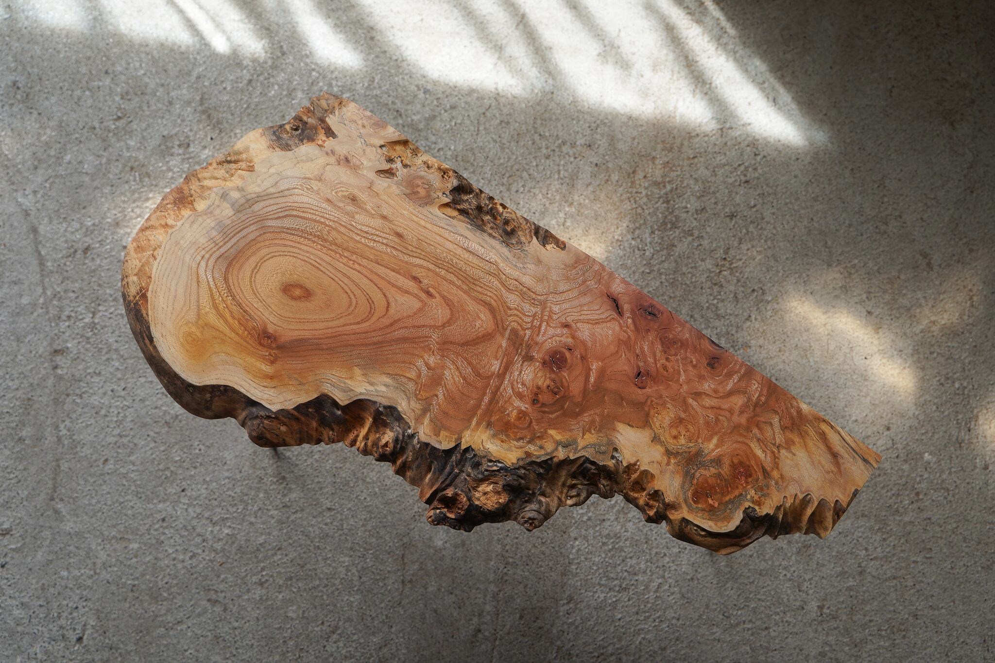 もともとは2mくらいある一枚板だったんですけど、そのままで使っても大袈裟ですし、やや反っていたので思い切ってカットしました。もちろんいいところだけを抽出しています。