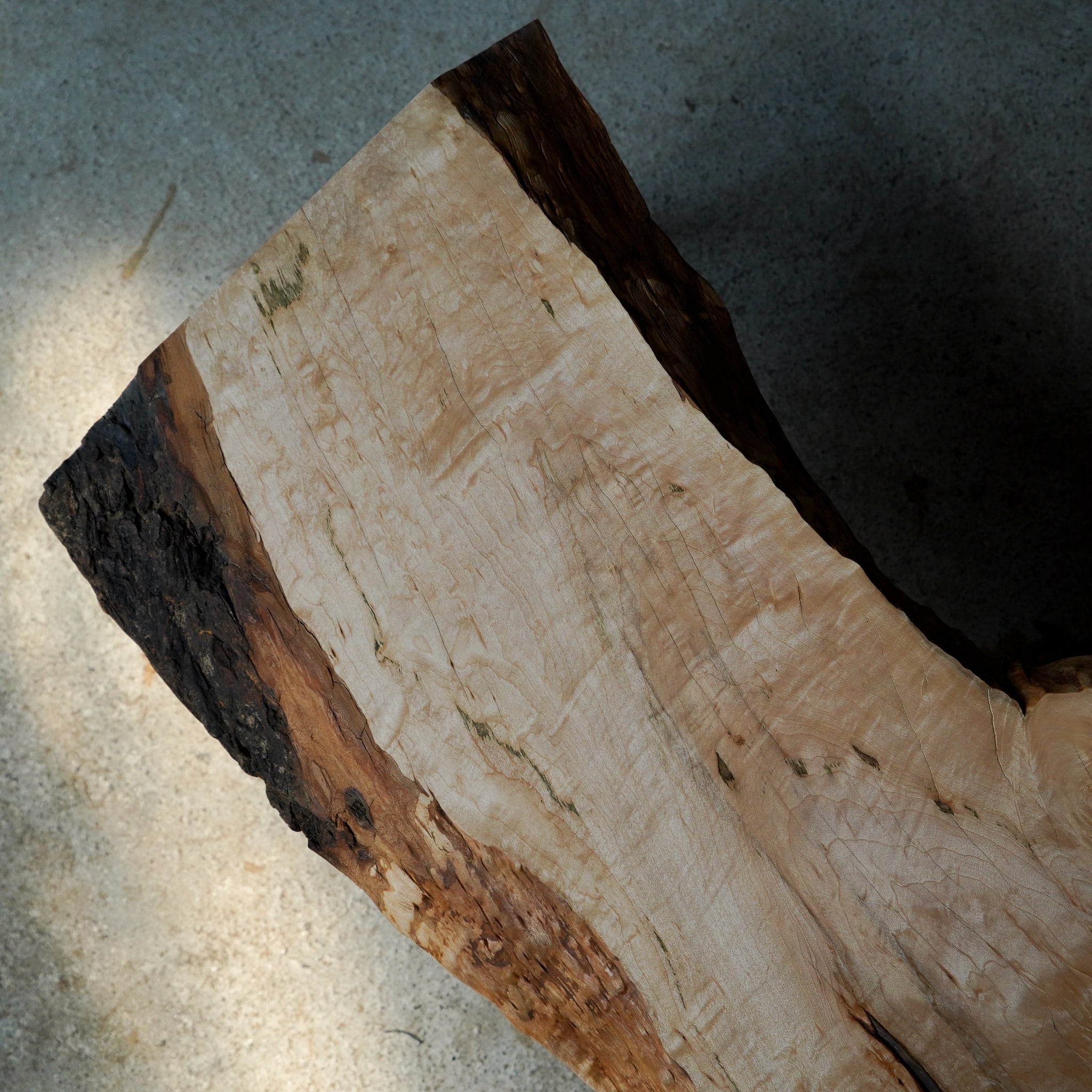 日本産だとカエデ、外国産だとメープルと呼ばれています。カエデはご存知の通り品質が優良な樹種です。強度や曲げ耐性、切削性の良さ、経年による色合いの変化などが好まれる為に家具に使われる事が多いです。もちろんテーブルの天板としても人気なのですが、幅の広い素材は少なく非常にレアです。