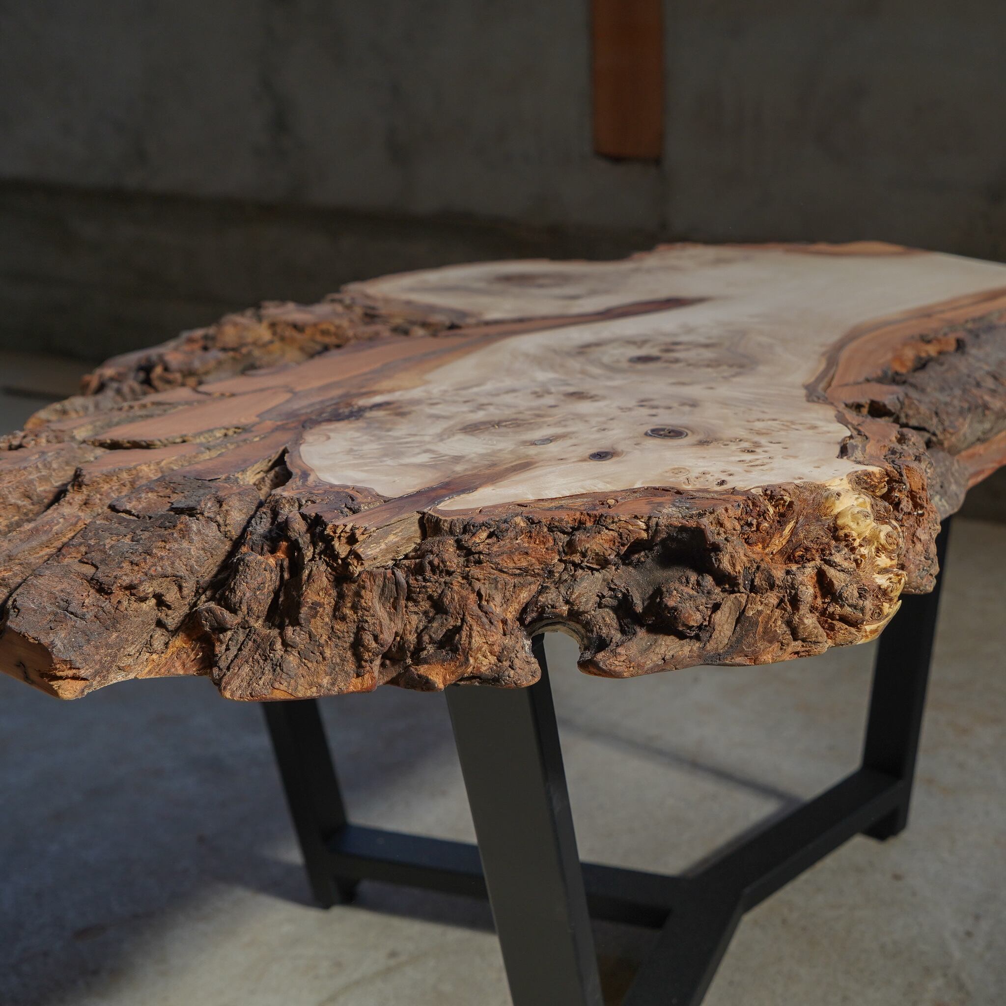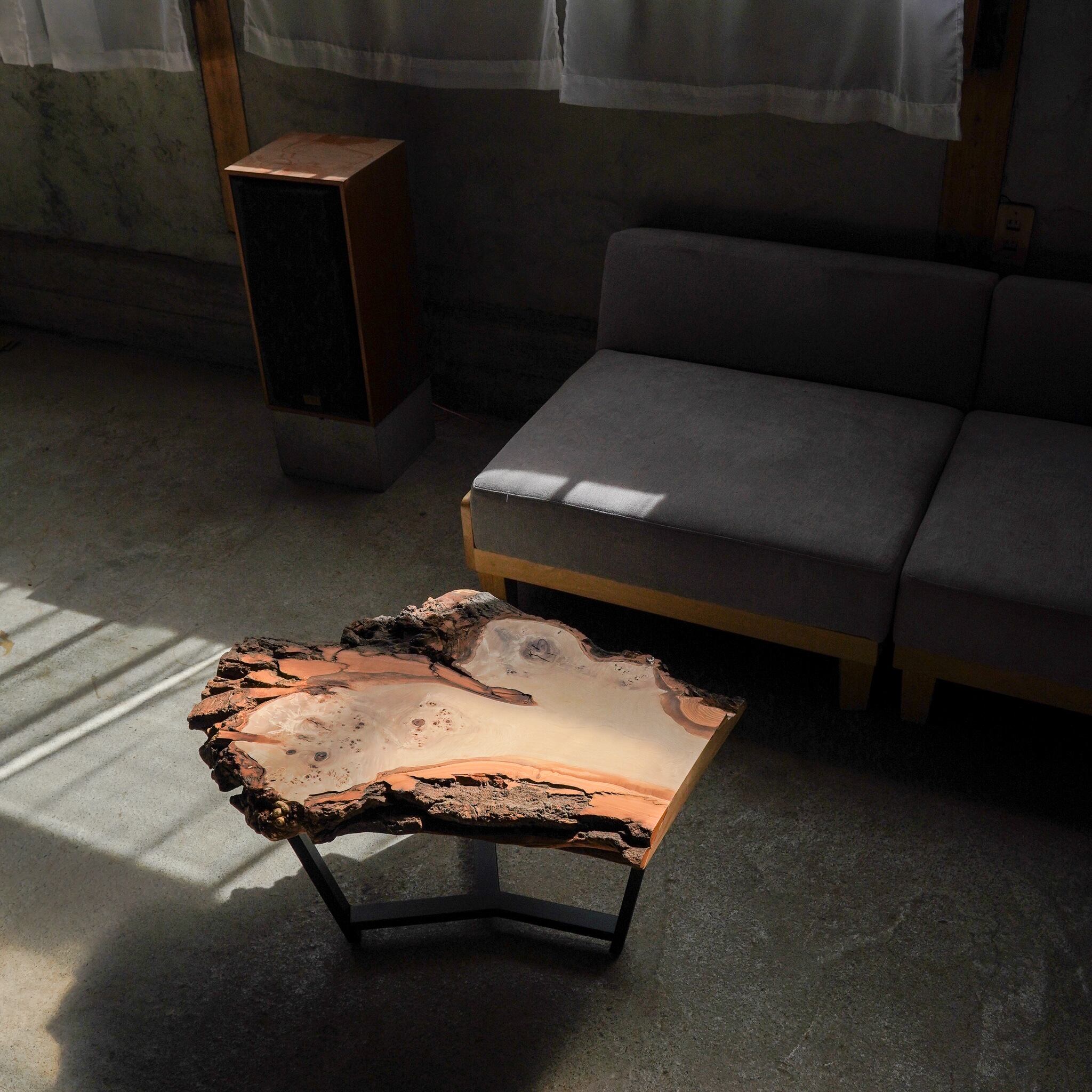 ゴツゴツした樹皮が個性的なポプラの一枚板ローテーブルです。