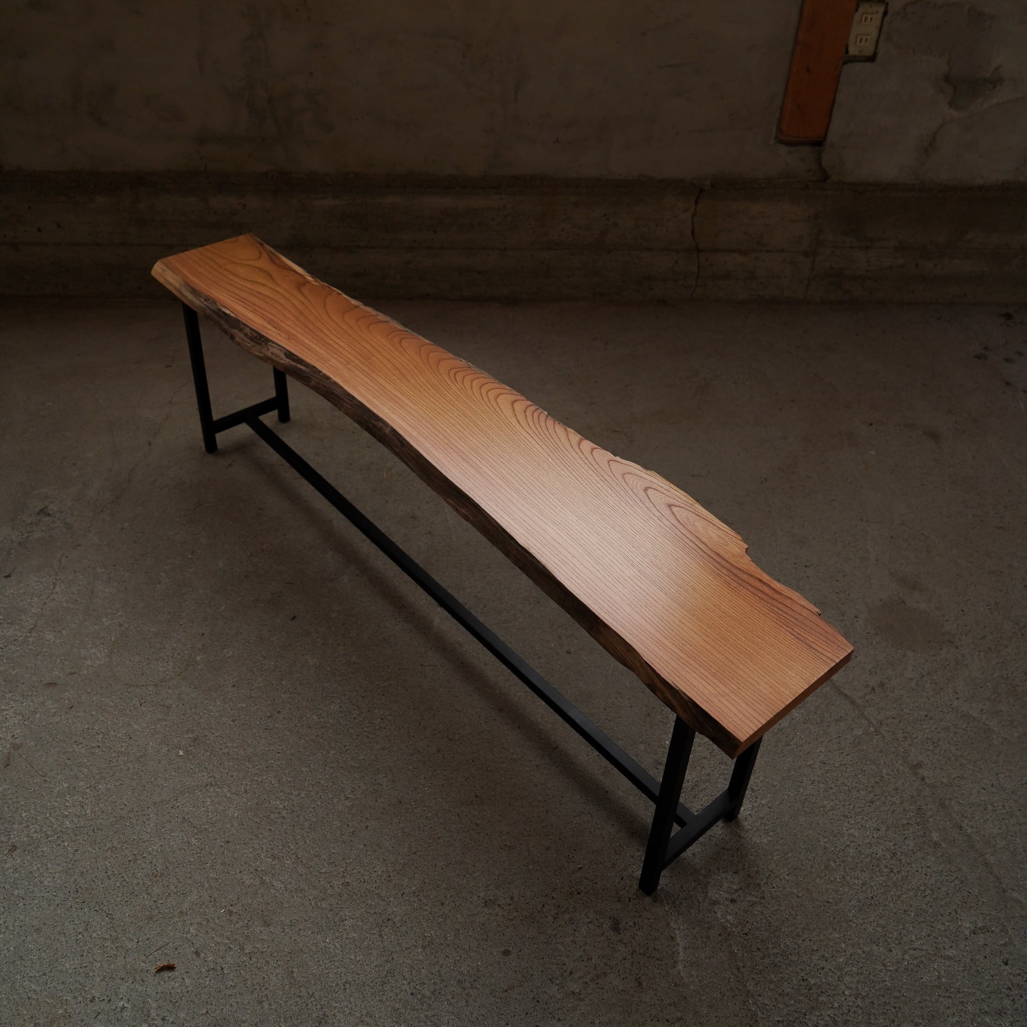 美しい杢目のある材や珍しい輸入材、大きくて立派で欠点の全く無い一枚板、そんな高級な板は人間に大事にされ、乾燥期間中も管理されますが、そういう素材には絶対に出せない空気がこの板にはあります。